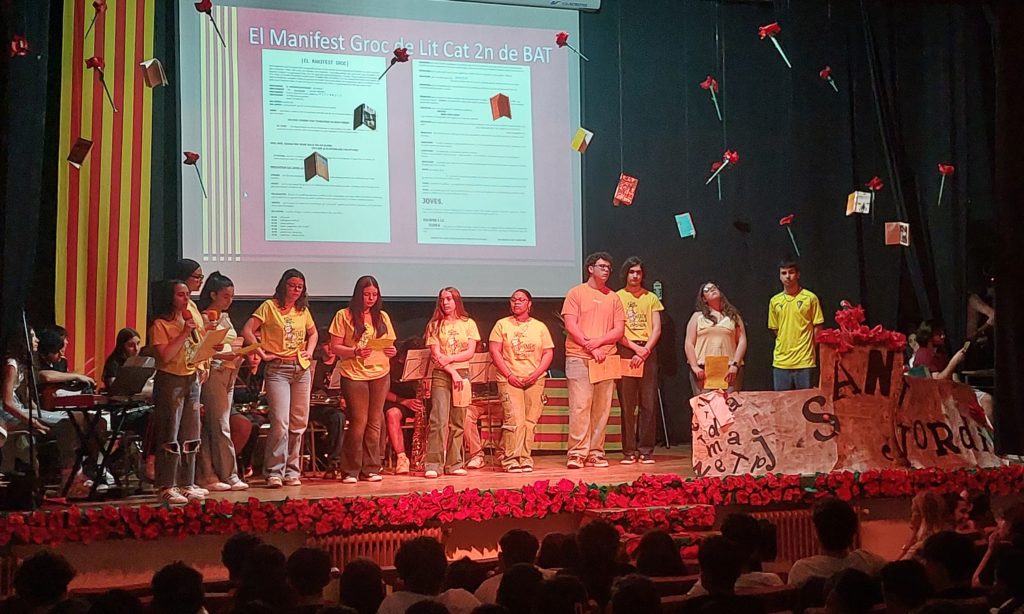 La literatura també ha tingut un paper central amb la lectura de poemes a càrrec dels alumnes de 1r ESO, amb una mostra de poesia visual creada per nois i noies de 1r de Batxillerat, i amb el text reivindicatiu, EL MANIFEST GROC, dels alumnes de 2n de Batxillerat.